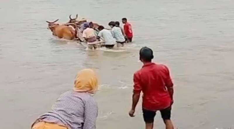 उफनती नदी में बैलगाड़ी बनी एकमात्र सहारा