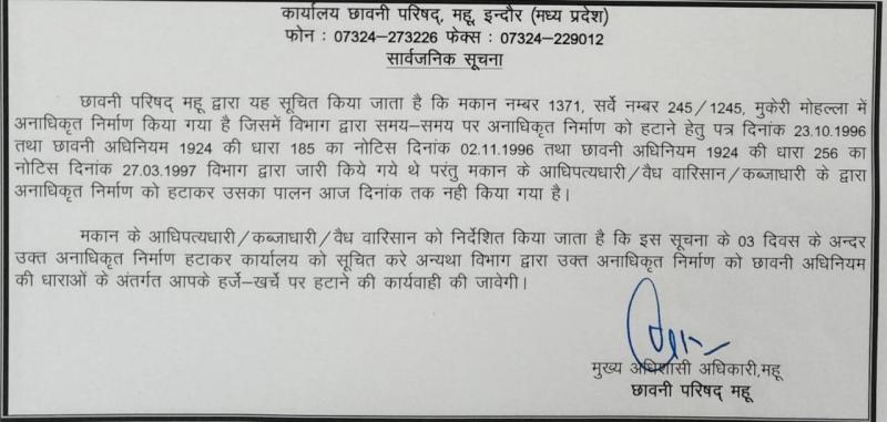 इंदौर महू।   दिल्ली बम धमाके के बाद हड़कंप मचाने वाली अल-फलाह यूनिवर्सिटी के चेयरमैन और ट्रस्ट प्रमुख जवाद सिद्दीकी की मुश्किलें लगातार बढ़ती जा रही हैं। महू छावनी परिषद ने जवाद और उसके भाई हमूद सिद्दीकी के महू स्थित चार मंजिला मकान पर कार्रवाई की तलवार लटका दी है। यह घर पत्ती बाजार स्थित कायस्थ मोहल्ला में है और कैंट बोर्ड ने इसे अनधिकृत निर्माण घोषित कर दिया है। बोर्ड ने धमाके से जुड़े दस्तावेज़ों की जांच के बाद मकान पर बड़ा नोटिस चस्पा करते हुए तीन दिन में कब्जाधारी को खुद निर्माण हटाने का आदेश थमा दिया है। अल्टीमेटम साफ है निर्माण खुद गिराओ, वरना कैंट बोर्ड गिराएगा और खर्च भी तुमसे ही वसूल करेगा।छावनी क्षेत्र में इस तरह की कड़ी कार्रवाई बेहद कम देखने को मिलती है, लेकिन दिल्ली धमाके की कड़ियों ने पूरे मामले को बेहद संवेदनशील बना दिया है।