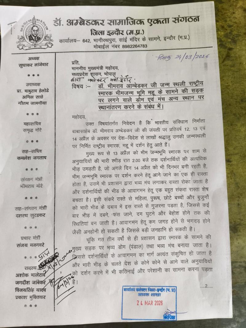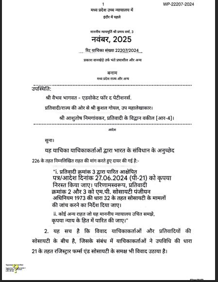 इंदौर। संविधान निर्माता डॉ. बाबासाहेब आंबेडकर नगर (महू) स्थित भीम जन्मभूमि स्मारक विवाद में माननीय हाईकोर्ट खंडपीठ इंदौर ने 3 नवंबर 2025 को धारा 32 और नियम 21 के तहत कार्यवाही के आदेश उपसचिव (उद्योग), पंजीयक भोपाल एवं सक्षम प्राधिकारी को जारी किए थे। उक्त आदेश के अनुपालन में पंजीयक, भोपाल के समक्ष जारी सुनवाई में समिति के कथित सचिव राजेश वानखेड़े ने समिति की जांच नहीं करने और आवेदकों के प्रकरण को खारिज करने हेतु आपत्ति लगाई थी। जिसको पंजीयक भोपाल ने खारिज करते हुए गुण–दोषों के आधार पर ही प्रकरण के निराकरण करने को योग्य बताया। जिससे अब नकली बहुमत बनाने के लिए अपने भाई भतीजों रिश्तेदारों और करीबियों को फर्जी सदस्यता बांटने के विवाद में वैध सदस्यों द्वारा की जा रही जांच और रिकॉर्ड जब्ती की मांग का रास्ता साफ होता दिखाई दे रहा है।