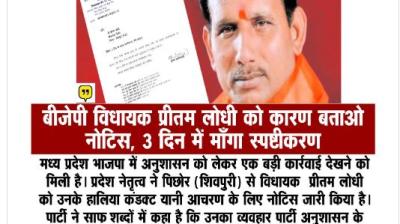 भाजपा ने विधायक प्रीतम लोधी को थमाया नोटिस, 3 दिन में मांगा स्पष्टीकरण