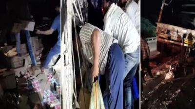 सड़क पर शराब से भरा ट्राला पलटा, लूट मचाने पहुंची भीड़ ने पुलिस पर किया पथराव